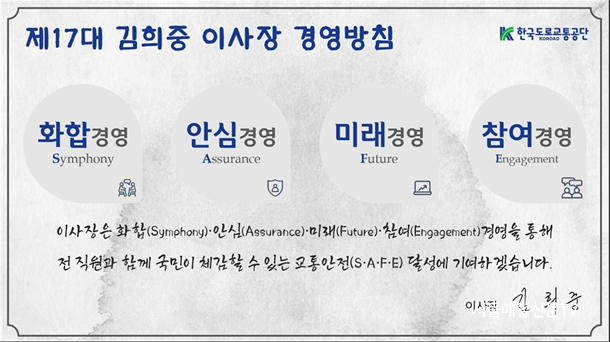 »õ·Î¿î °æ¿µ¹æÄ§Àº ¡âÈ­ÇÕ(Symphony) : ¹è·Á¿Í ¾çº¸Æ² ÅëÇÑ ±àÁ¤ÀÇ Á¶Á÷¹®È­ ±¸Ãà ¡â¾È½É(Assurance) : ¾ÈÀüÀ» ³Ñ¾î ±¹¹ÎÀÌ ¾È½ÉÇÒ ¼ö ÀÖ´Â ±³Åëȯ°æ Á¦°ø, ¡â¹Ì·¡(Future) : ¾÷¹«ÇÁ·Î¼¼½º °³¼± ¹× ½Å»ç¾÷ ¹ß±¼, ¡âÂü¿©(Engagement) : ÁÖÀÎÀǽÄÀ» ¹ÙÅÁÀ¸·Î ±¹¹Î Âü¿© À¯µµ µî 4°³ ¹æÄ§À¸·Î ±¸¼ºµÇ¾î ÀÖ´Ù.