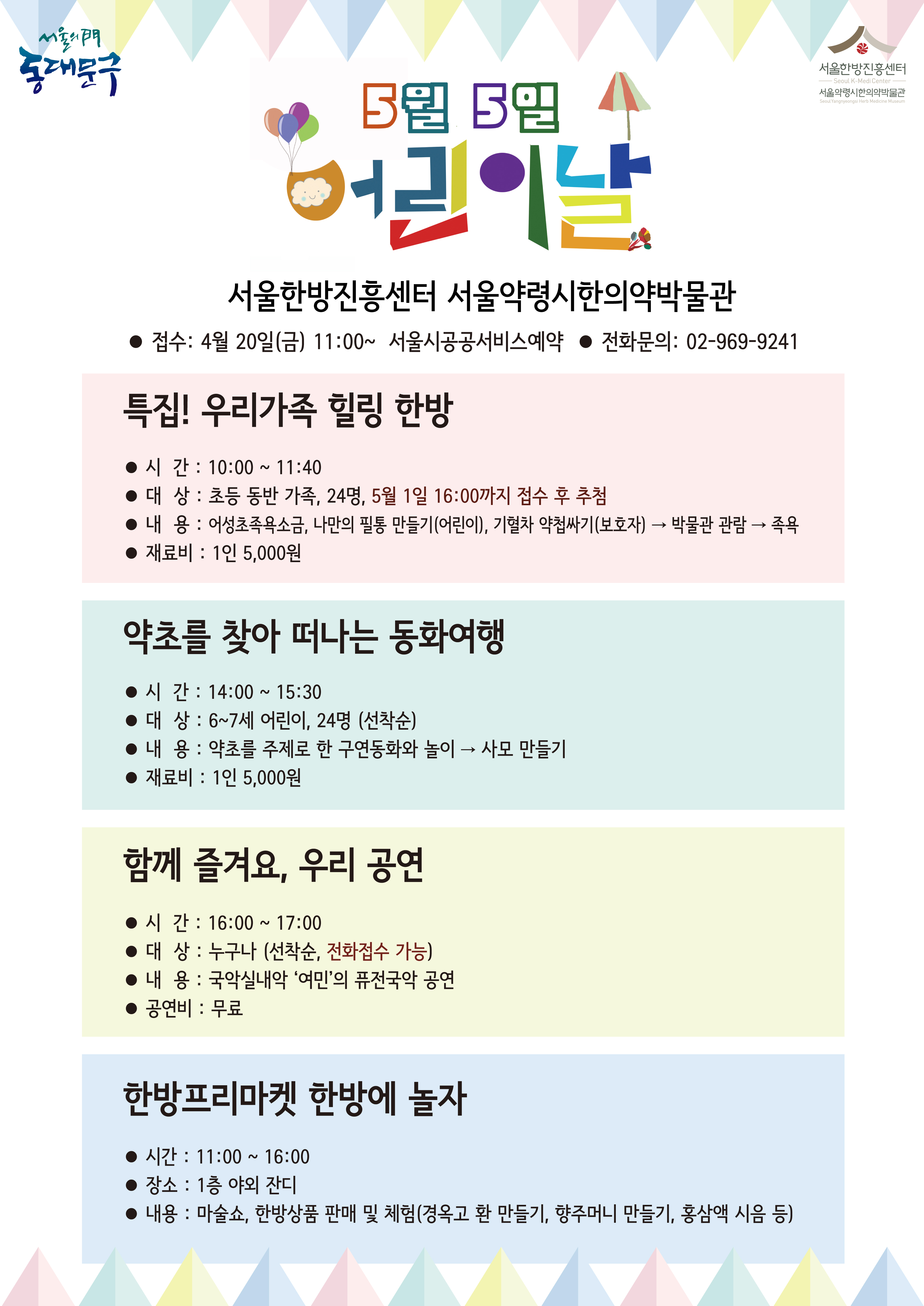 ¡®Æ¯Áý ¿ì¸®°¡Á· Èú¸µ Çѹ桯, ¡®¾àÃʸ¦ ã¾Æ ¶°³ª´Â µ¿È¿©Ç࡯ Âü°¡ºñ´Â 1ÀÎ 5,000¿øÀ̸ç, ¼¿ï½Ã °ø°ø¼ºñ½º ¿¹¾à »çÀÌÆ®¸¦ ÅëÇØ Âü¿©ÇÒ ¼ö ÀÖ´Ù. ½Åû ¹× Á¢¼ö µî ÀÚ¼¼ÇÑ »çÇ×Àº ¼¿ïÇѹæÁøÈï¼¾ÅÍ·Î ¹®ÀÇÇÏ¸é ¾È³» ¹ÞÀ» ¼ö ÀÖ´Ù.