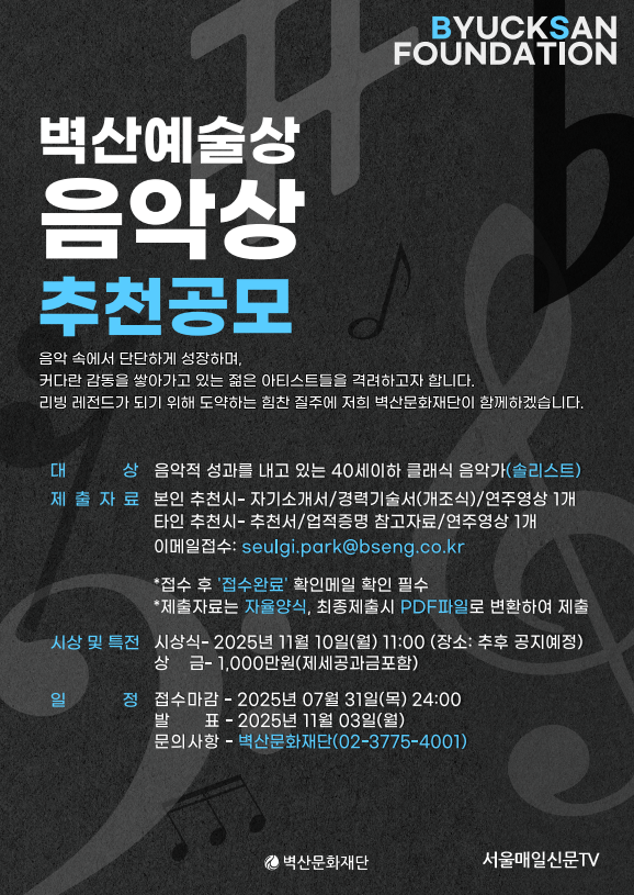 ¡ã 2025 º®»ê¿¹¼ú»ó À½¾Ç»ó ¼Ö¸®½ºÆ® Ãßõ °ø¸ð »çÁøÁ¦°ø=º®»ê¹®È­Àç´Ü
